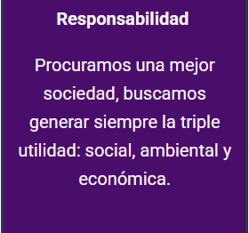 Responsabilidad Procuramos una mejor sociedad, buscamos generar siempre la triple utilidad: social, ambiental y económica. |